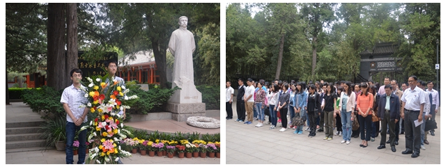 活動伊始,由學生代表為李大釗烈士敬獻花籃。朵朵白花,象征著烈士心靈的純潔無瑕,象征著烈士崇高的品質和無私的精神,寄托著師生們深深的哀思,代表著后輩對李大釗烈士的無限敬仰。之后,全體師生在李大釗烈士的墓碑前沉重默哀,向他頑強不屈、堅持不懈、視死如歸、盡忠報國的精神致敬。