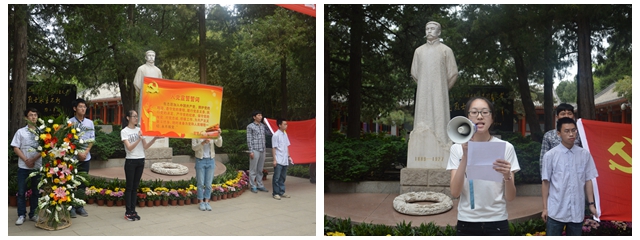今年是中國共產黨建黨94周年,也是北理工第十四次黨代會召開之年。5月6日下午,生命學院黨委組織教師和學生黨員,聚集在李大釗烈士陵園,隆重舉行新黨員入黨宣誓和老黨員重溫入黨誓詞活動,向李大釗同志及革命烈士們表達崇高的敬意,也是號召廣大黨員以實際行動迎接黨的生日及學校第十四次黨代會的召開。參加此次活動的有學院黨委書記劉存福,副院長唐曉英,黨委副書記、副院長劉曉俏、黨委副書記胡士坤(掛職)以及教師黨員和學生黨員。活動由劉曉俏主持。