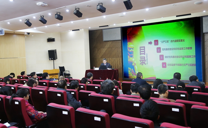 楊志宏從“三嚴三實”的內涵現實意義、黨風廉政建設和紀檢監察工作職責、做好黨風廉政建設和紀檢監察工作、紀檢監察干部踐行“三嚴三實”的具體要求等四個方面與大家進行了交流。黨課報告中,楊志宏著重梳理了“三嚴三實”提出的背景、時代價值、實踐標準和基本遵循;闡述了學校各級黨組織和各級領導班子成員肩負的黨風廉政建設和反腐敗工作職責,通過通報近期高校系統出現的嚴重違紀案例,深入講解“一崗雙責”、“一案雙查”的概念。楊志宏指出,當前黨風廉政建設和紀檢監察工作的重點是:把紀律和規矩挺在紀檢工作的最前沿,繼續做好紀律檢查工作;深入貫徹落實中央八項規定精神,持之以恒糾正“四風”;查找制度漏洞,做好規章制度的完善和執行。楊志宏對學校紀檢監察干部踐行“三嚴三實”還提出明確要求,務必做到增強“三個自覺”,即在貫徹黨的教育方針上進一步增強自覺、在落實學校十四次黨代會精神上進一步增強自覺、在推動學校建設改革發展上進一步增強自覺;落實“三個必須”,即必須對黨忠誠、必須個人干凈、必須敢于擔當;提高“三個能力”,即提高監督能力、提高執紀能力,提高問責能力。