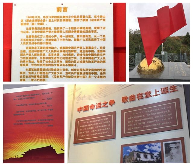 “沒有共產黨就沒有新中國”紀念館,位于房山區霞云嶺鄉堂上村,1943年10月,中共黨員曹火星同志在此創作了這首膾炙人口的不朽歌曲——《沒有共產黨就沒有新中國》。當年,堂上村曾隸屬于八路軍鄧華支隊開辟的平西抗日根據地。平西是中國共產黨人及其所領導的八路軍新四軍在中華民族生死存亡的關鍵時刻,挺身而出,共赴國難,積極倡導抗日民族統一戰線,建立敵后根據地,實行全民族抗戰的一個縮影。置身于平西抗日根據地的曹火星,對中國命運由誰決定有著鮮明的答案。《沒有共產黨就沒有新中國》這首歌唱出了一個歷史鑄就的結論,同時也唱出了人民的心聲,唱出了一個歷史真理。2001年,當地政府對《沒有共產黨就沒有新中國》詞曲創作地進行了修葺整治,建立了《沒有共產黨就沒有新中國》詞曲創作地陳列館,并在院內建設了以“沒有共產黨就沒有新中國”為主題的紀念雕塑。 2006年6月26日,新建“沒有共產黨就沒有新中國”紀念館。紀念館采取依山就勢、單層連體的建筑方式,體現平西山地民居風格,分為A、B、C三個區域。大型主題展覽共分三部分,在展覽藝術表現上綜合運用文字、攝影、繪畫、浮雕、蠟像、幻影成像等傳統與現代相結合的藝術手段,全部展覽展出照片800幅,制作油畫1幅,大型浮雕1幅,蠟像1個,幻影成像1幅。