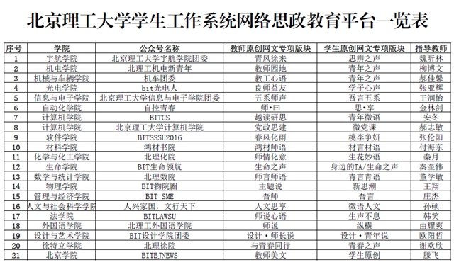 網(wǎng)絡(luò)思政教育工作是北理工思想政治教育工作的重要陣地,學(xué)生工作處高度重視大學(xué)生網(wǎng)絡(luò)思想政治教育工作,牢牢把握住時代脈搏,注重新媒體技術(shù)運(yùn)用,著力推動思想政治教育工作同信息技術(shù)高度融合。通過各方努力、各項(xiàng)舉措搭建學(xué)生思想政治教育的新平臺,使工作的觸角進(jìn)一步延伸、思路進(jìn)一步拓寬、效果進(jìn)一步顯化,為北理工雙一流建設(shè)做出新貢獻(xiàn)!