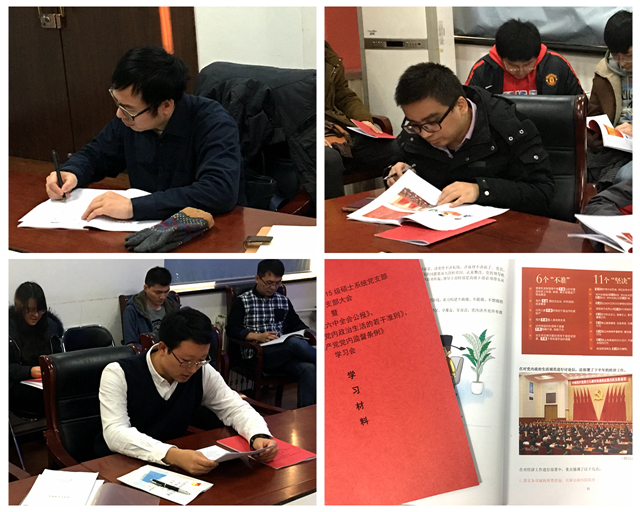 關子霄向大家傳達了習近平總書記在全國高校思想政治工作會議重要講話精神,從“一個核心”、“兩個替補”、“三份文件”等多個角度對《準則》進行了解讀;接著,馬糧帶領大家集體學習了《公報》、《條例》內容,要求各位黨員切實在思想上高度信賴、理論上深刻認同、政治上堅決維護、行動上始終緊跟習近平總書記這一黨中央的核心、全黨的核心;在集體學習之后,黨員結合自身對《公報》的理解積極發言,根據支部為黨員們制作的學習手冊及時進行學習和討論。