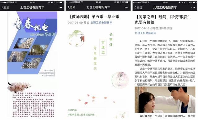 機電學院團委依托“機電新青年”微信公眾號開展思想引領。先后推出“青春榜樣”系列文章,分享優秀學子成長成才經歷,讓團員青年時刻接受思想信仰教育,學習榜樣,堅定信仰;堅持每月推送教師園地系列文章,拓寬了機電學院師生之間相互了解、平等交流的渠道,彰顯青年教師思想風貌,展現青春風采、倡導人文情懷、把握時代脈搏,引領青年團員健康的思想動向;每月一期“青春機電”電子刊物以新穎的形式,按月對學院動態進行跟蹤、報導和總結,記錄機電學院各大新聞,彰顯青春風貌,服務全院師生,積極宣揚健康、向上、和諧的校園生活。 與此同時,機電學院團委創新工作方法,推出“青年節日說”系列活動,依托植樹節、清明節、端午節、重陽節等傳統節日及五四運動、七一黨的生日等紀念日開展線上線下相結合的寄語征集活動,充分利用新媒體弘揚傳統文化、傳播正能量。