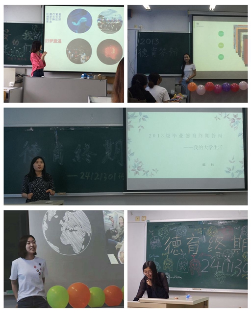 北理工外國語學(xué)院2013級(jí)畢業(yè)生德育終期答辯以“回顧大學(xué)生活、分享收獲遺憾、展望前途未來”為主旨,經(jīng)過了為期一個(gè)月“宣傳動(dòng)員、個(gè)人總結(jié)、組織籌劃、開展答辯”的工作部署,24111301、24111302、24121301、24131301、24141301班德育終期答辯圓滿結(jié)束。外國語學(xué)院黨委書記楊暉、外國語學(xué)院院長李京廉、副院長姜愛紅、副院長張萊湘、副書記副院長周芳集、2013級(jí)本科生班主任、任課老師、輔導(dǎo)員以及2013級(jí)全體學(xué)生參加了本次各班的德育終期答辯會(huì)。