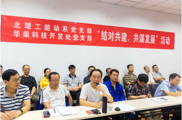 過去的十幾年,北京理工大學(xué)作為總設(shè)計師單位,與副總設(shè)計師單位河北華北柴油機(jī)有限公司精誠團(tuán)結(jié)、攻堅克難,研制成功了我國新一代輕型坦克的動力裝置?!?32”也成為所開發(fā)的缸徑為132mm柴油機(jī)的代名詞。本次參與支部共建活動的黨員都是參與“132”動力研發(fā)的核心科研人員。北京理工大學(xué)“132”動力總設(shè)計師劉福水教授、河北華北柴油機(jī)有限責(zé)任公司副總經(jīng)理商海昆、北京理工大學(xué)機(jī)械與車輛學(xué)院副院長韓愷以普通黨員的身份參加了此次活動?;顒釉谌w黨員高唱《保衛(wèi)黃河》的歌聲中拉開序幕。