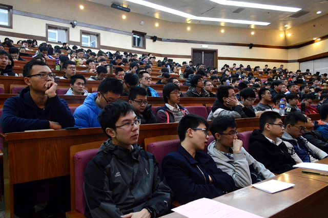 在完成十九大精神的傳遞后,唐嘉陵給參加本次報(bào)告會(huì)的師生講述了作為我國(guó)第一臺(tái)自主設(shè)計(jì)研制的深海載人潛水器主駕駛的心路歷程以及伴隨“蛟龍?zhí)枴弊呦蛏詈5钠D辛。30多次的下潛經(jīng)歷,7000多米的下潛深度,連續(xù)4年潛水器的駕駛經(jīng)歷;這一系列代表著成就的數(shù)字背后有著另外一串?dāng)?shù)字:6年深潛專業(yè)的學(xué)習(xí)和訓(xùn)練,一年中11個(gè)月在海上“放逐”,單次連續(xù)下潛作業(yè)長(zhǎng)達(dá)12小時(shí),正是這樣一種對(duì)海洋事業(yè)和深潛工作的堅(jiān)持和熱愛(ài),唐嘉陵在太平洋底刻下了屬于中國(guó)的深度。隨后,唐嘉陵通過(guò)兩個(gè)珍貴的視頻資料向同學(xué)們展示了“蛟龍?zhí)枴笨瓶缄?duì)的海洋科考工作和海上日常生活,使同學(xué)們對(duì)神奇的海底世界充滿無(wú)限向往。最后,唐嘉陵講述了他的深海潛航夢(mèng)——把“蛟龍?zhí)枴贝蛟斐蔀閲?guó)內(nèi)國(guó)外科學(xué)研究的優(yōu)質(zhì)服務(wù)平臺(tái),并陳述了海洋領(lǐng)域人才缺乏的現(xiàn)象,希望有更多優(yōu)秀的人才能獻(xiàn)身海洋領(lǐng)域,共同把我國(guó)建設(shè)成為海洋強(qiáng)國(guó)。