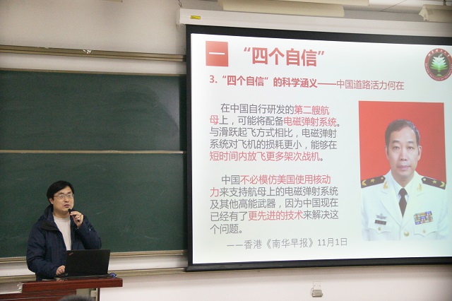 藺偉從“四個自信的提出”“中國特色社會主義”“四個自信的科學含義”三個方面對“四個自信”進行深入講解。通過對中國特色社會主義歷程各個階段的深入分析,剖析了其特有的歷史必然性和優越性,通過生動貼切的視頻講解和準確的數據,向同學們展示了中國共產黨的歷史新變革,表達了對未來的展望。