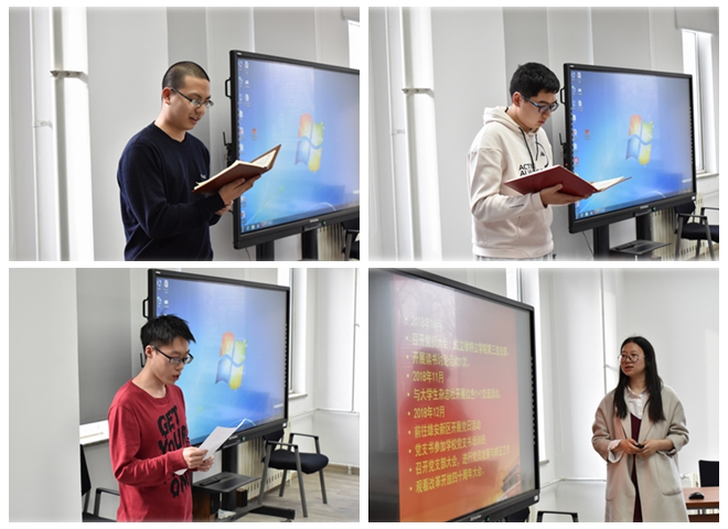 首先,舉行了新發展預備黨員入黨宣誓儀式。伴隨著雄壯的國際歌,在領誓人的帶領下,13名預備黨員面對鮮紅的黨旗,緊握右拳,以飽滿的熱情,洪亮的聲音莊嚴宣誓,表明自己志愿為黨和國家奮斗終身的堅定決心。孫心桐代表宣誓的預備黨員發言,他激動地說:“我會永遠銘記這一神圣而莊嚴的時刻,牢記黨員的責任與義務,通過不斷的努力成為一名優秀黨員?!瘪R克思主義學院張雷作為教師代表勉勵同志們要牢記習近平總書記的諄諄教誨,不忘初心、砥礪奮進,勤奮好學、務實肯干,努力練就過硬本領。