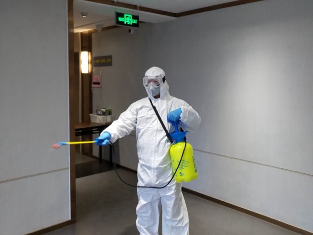 招待所公共區域消毒與垃圾處理每次都需要兩三個小時,孫彪每天要重復三到四次,防護服包裹下的衣衫濕了又干,干了又濕,由于戴著口罩,護目鏡又經常被汗水打濕,模糊地看不清前方的路。年近50、身形瘦小的孫彪,每次都要背著滿滿一大桶消毒液在招待所一到六層上上下下,同事們看在眼里,疼在心中,當勸說他換個人休息一下時,孫彪總是樸實的笑著說:“這種事還是讓我們有經驗又有勁兒的男同志來干吧!”