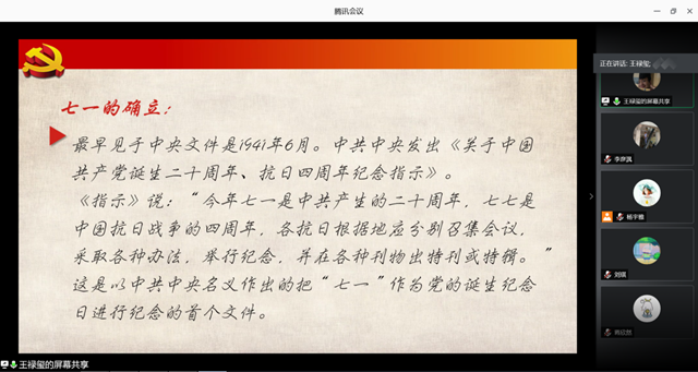 學習黨的歷史,學習理論,提高自身理論素養,是我們黨員為黨獻禮的最好方式之一。楊宇雅、王祿璽、劉琪三位同志從“七一”黨的生日出發,講解建黨日定在“七月一日”的由來,并回顧黨99年來的光榮歷程。“‘七一’這個光輝的節日深深地銘刻在全黨和全國各族人民的心中。它成為人們每年進行紀念的一個重要節日,也成為中國節日文化的一部分。”