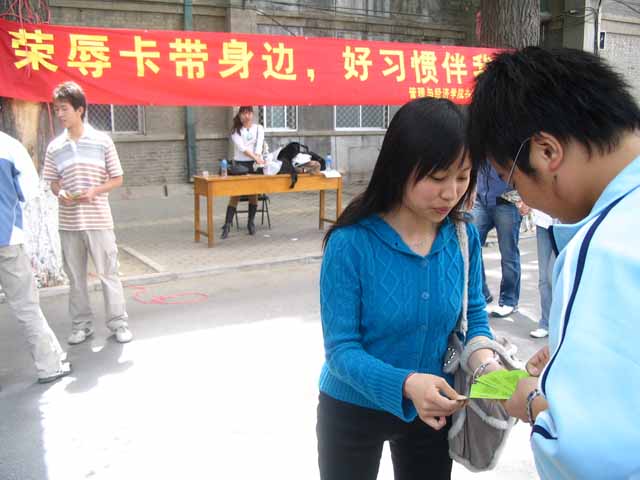 2006年4月24日,管理與經(jīng)濟學院共產(chǎn)主義學習會在京工食堂的對面舉辦了“榮辱卡帶身邊,好習慣伴我行”贈送“榮辱卡”活動。此次活動是管理與經(jīng)濟學院共產(chǎn)主義學習會響應中共中央關(guān)于宣傳八榮八恥,樹立社會主義榮辱觀的號召,向全校師生發(fā)出倡議以八榮八恥規(guī)范自身言行的系列活動之一。漂亮的小卡片一發(fā)出便受到同學們的關(guān)注和喜愛,以貼心的方式向全校師生發(fā)出倡議,此次活動取得了良好的效果。