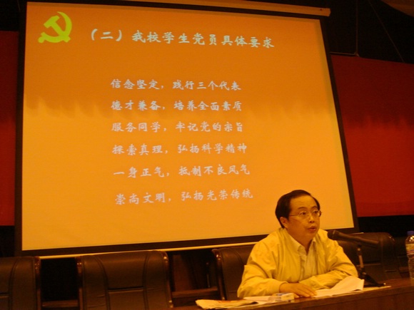 2006年10月13日(周五)晚6:30,理學院黨委書記何明老師在七號樓報告廳給全院2006級新生講授了第一次黨課。