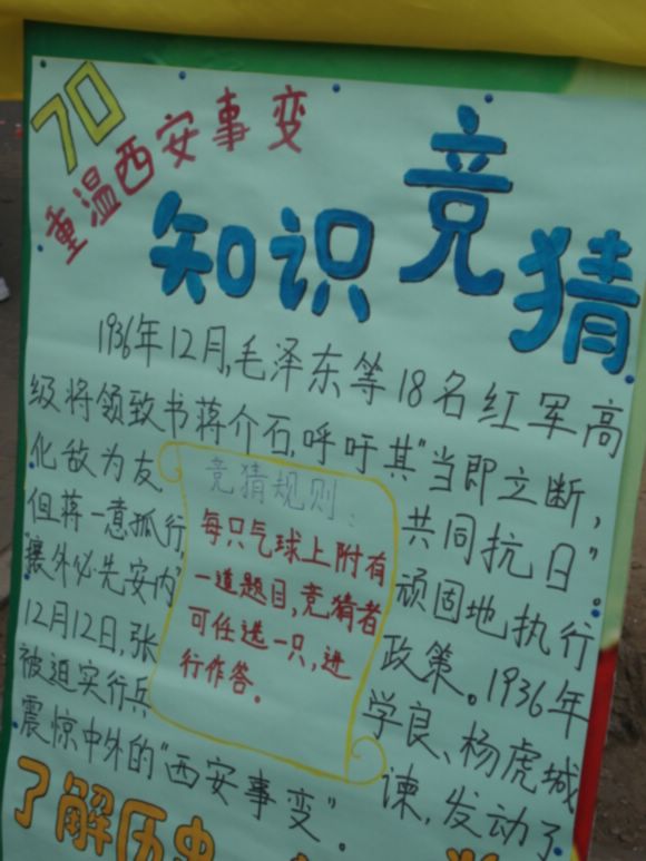 12月12日,為了增強同學們對西安事變的了解,并且在事件爆發七十周年之際,弘揚愛國主義精神,激發理工學子的愛國熱情,在全國各地紛紛展開紀念西安事變七十周年活動的同時,我校管理與經濟學院學生會也組織了紀念活動,在京工餐廳對面組織一次別具特色的西安事變有獎知識競猜活動。