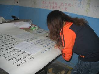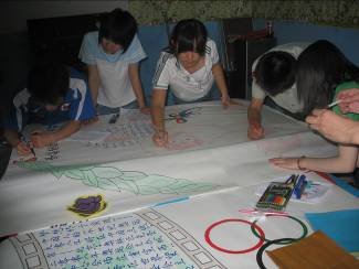 活動一確立下來,大家就明確分工,利用課余時間采購材料、工具;查找相關(guān)資料并做出篩選;設(shè)計板式處理圖片,利用晚上的時間齊聚三號樓地下室開始我們的制作過程。雖然環(huán)境簡陋,卻絲毫不能分散工作時的注意力。大家一齊上陣,邊寫邊畫,好不熱鬧。