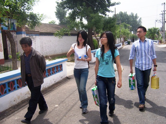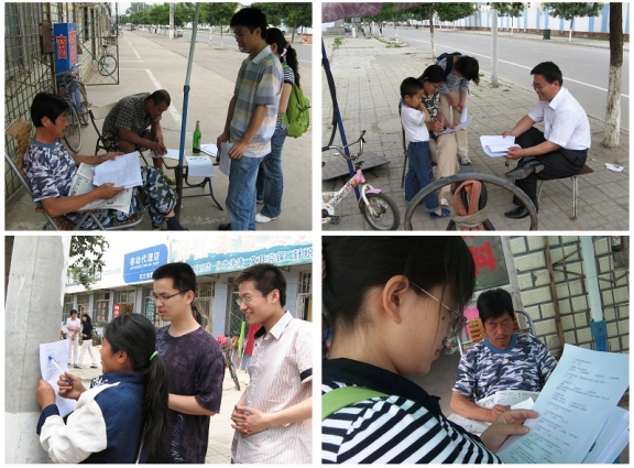 在“村官”周航同學的帶領下,黨支部成員首先參觀齊家務村的新農村建設情況,黨員們通過自身感受,深刻的理解了新農村建設的巨大成就和深遠意義,黨支部自費印制了有關奧運和抗震相關知識的簡明手冊,向村民們發放宣傳,并做了有關奧運和抗震的問卷調查活動。