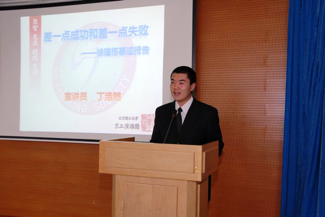 有這樣一支球隊,稱霸大學生足球聯賽數年;有這樣一支球隊,是參加中甲的唯一一支學生隊伍;有這樣一支球隊,在世界大學生運動會上取得第七名的成績,中國男足沒有做到的他們做到了,這就是令所有北理工人驕傲的北理足球隊.第四位上臺的李雪松同學為我們講述了北理工足球隊的動人故事.這雖然只是一支校園隊伍,雖然他們的訓練條件很簡陋,經濟條件,訓練場地也都很有限,但是他們用自己堅強的意志,超強的身體素質,和極強的團隊精神創造了一個學生球隊的奇跡.足球不是個人的運動,團隊精神才是足球這項集體運動的靈魂.理工的運動員們正是秉承了這種團隊精神才創造了一個又一個輝煌。