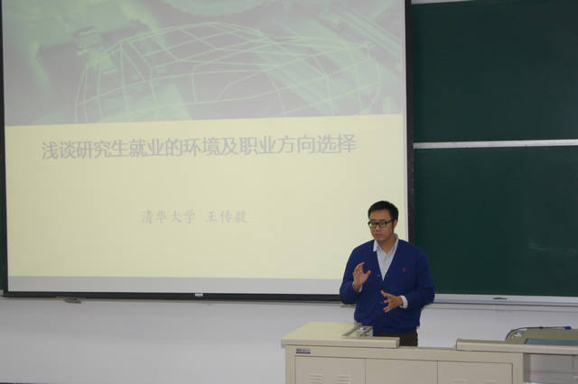 隨后清華大學王傳毅博士后、教育研究院教師劉進博士為來自全校各學院的100名參訓學員做了專題報告,拉開了此次培訓班培訓課程的序幕。王傳毅博士后以“淺談研究生就業的環境及就業方向選擇”為主題,結合自身研究從國際趨勢與國內趨勢兩大角度分析了當今研究生就業的外部環境與宏觀動態,并給同學們提出了“加強軟技能培養”、增強專業精神和職業道德、培養口頭和書面交際能力、培養團隊精神和協作能力、培養批判性思維和解決問題的能力、培養道德水平和社會責任心等建議。