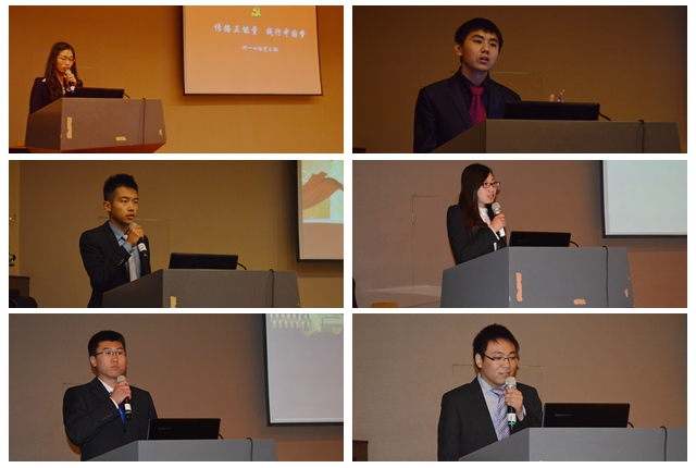 首先上場的是13研碩士四班黨支部的王灝同學(xué),她先解釋了“中國夢”和“正能量”在當(dāng)今的社會環(huán)境下的含義,之后她用三個感人的故事告訴我們應(yīng)該如何“傳播正能量,踐行中國夢”。隨后登場的科技創(chuàng)新創(chuàng)業(yè)基地黨支部的張偉同學(xué)則結(jié)合支部的特色,通過講述在新中國的發(fā)展過程中為國家、民族的科技進(jìn)步奉獻(xiàn)一生的科學(xué)家的故事,闡述如何將個人理想與中國夢相結(jié)合。13研碩士五班黨支部的鄭瑋同學(xué)的黨課主題也是中國夢,但他以時(shí)間為線索,描述了在黨史中“中國夢”的不斷變化,同時(shí)結(jié)合“中國夢,我的夢”這一主題,對于當(dāng)代學(xué)生黨員如何在實(shí)現(xiàn)中國夢的過程中做出自己的努力。第四個登場的是10級本科軟件工程一班黨支部的關(guān)放同學(xué),從“造謠者可恥”、“傳謠者可惡”和“信謠者可悲”三個角度深入淺出的討論謠言起因和盲從的危害,分析如何理性、辯證的看待問題,強(qiáng)調(diào)當(dāng)代大學(xué)生在杜絕謠言方面應(yīng)該擔(dān)當(dāng)?shù)呢?zé)任。之后10級本科軟件工程二班黨支部的郭仔昂同學(xué),他的黨課分為三個層次,首先引導(dǎo)黨員們在網(wǎng)絡(luò)社會中,不但要自己不信謠、不傳謠,還要積極地利用網(wǎng)絡(luò)平臺引導(dǎo)周圍的群眾,做表率。與此同時(shí),思考如何在網(wǎng)絡(luò)社會中繼續(xù)服務(wù)群眾,履行黨員義務(wù)。最后,結(jié)合身邊剛剛發(fā)生的例子,引導(dǎo)大家學(xué)會從生活中的細(xì)節(jié)里踐行黨員職責(zé),于細(xì)微處體現(xiàn)黨員的先進(jìn)性,把服務(wù)群眾的思想落實(shí)到具體的行動中去。最后上場的是10級本科信息安全黨支部的趙崇同學(xué),他將國內(nèi)社會目前所存在的一些問題以及一些消極言論與前任國務(wù)院總理溫家寶的一句“莫道今年春將盡,來年春色倍還人”做對比,來號召廣大青年堅(jiān)定信念。此外他還對國內(nèi)腐敗問題的深層原因進(jìn)行著重分析,深刻挖掘造成不良現(xiàn)狀的思想根源。