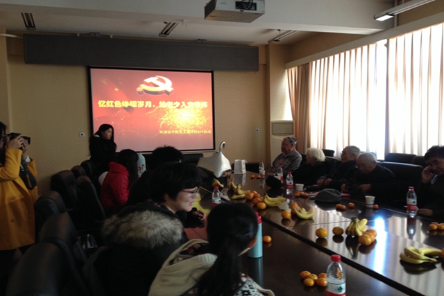 下午2時,支部共建活動準時召開。首先,外國語學院2011-2013級黨支部書記劉春游代表學生支部發言,希望學生黨員能以此為契機,通過聆聽老教授們的切身經歷和真誠教誨,能有所啟發和收獲。之后教師黨支部書記張錦州老師介紹到場的老師們。此次參加活動的老師均為外國語學院退休的老干部,年齡最大的已有88歲,他們都曾在自己的教學崗位上兢兢業業,對黨、國家和學校都有非常深厚的感情。