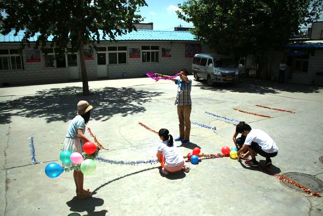 上午十一點,頂著炎炎烈日,負責現場布置的志愿者已經到位開始了會場的前期準備工作,而此時此刻孩子們正在午睡,為了不影響孩子們休息并且不耽誤聯歡會開場時間,綠風志愿者們盡量控制避免產生噪音,緊張而有序地開始布置會場。汗水揮灑在炙熱的水泥地板上,志愿者們不去理會天氣的炎熱和身體的疲憊,因為他們累在身上,樂在心中。