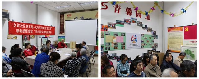 2014年3月以來,光電學院13級碩士學生黨支部與石景山區(qū)久筑社區(qū)黨支部緊密聯(lián)系,開展紅色“1+1”共建活動。久筑社區(qū)是位于石景山魯谷開發(fā)區(qū)西部的老型社區(qū),居民以60歲以上老人為主,黨支部成員大都是從上世紀四五十年代走來的老黨員。