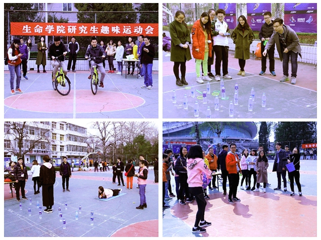 與此同時,運動會來設計了“運動,讓生命更精彩”為主題的研究生趣味運動項目,包括哪吒鬧海(套圈)、“靜止”的小黃車(自行車慢騎)、Let’go、知識帶我飛、烏鴉反哺、我的籃球夢等。運動會中,研究生同學在科研學習之余,積極參加體育活動,放松了身心,緩解了壓力。
