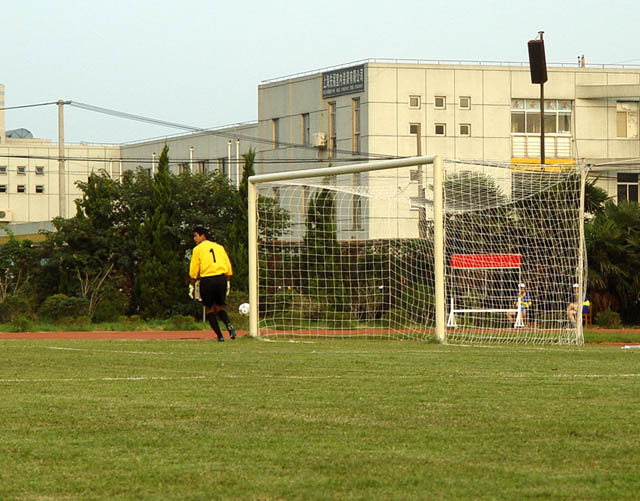 上半場比賽,上海隊拼搶比較激烈,占據了場上的主動,我方門前多次出現混戰局面,幸虧我校足球隊1號守門員孫程發揮出色,排除了險情。