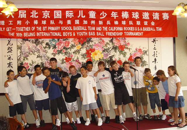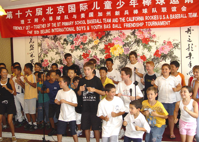 會上,兩國棒球的教練,隊員相互交流,切磋球技。孩子們表演節(jié)目,互送禮物,氣氛友好熱烈。