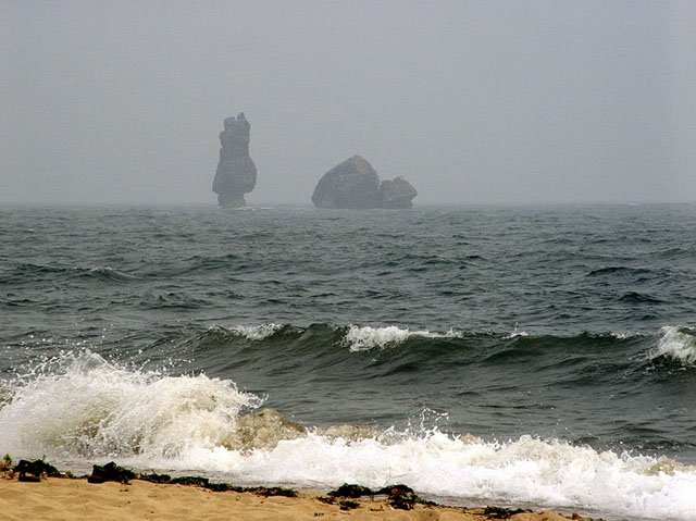 碣石距山海關15公里,位于綏中縣城西56公里處的止錨灣海濱,在距岸邊200余米的海面之中,聳立著三塊巨大礁石,高出海面約20余米。 這里也是民間傳說為孟姜女投海葬身之處。每逢落大潮,從岸邊到礁石隱約現出一條巨石鋪就的海中棧道,可直達礁石腳下。在姜女墳的東西兩側海岸,各有一峭壁伸向海面,東側叫紅石砬子,西側叫黑石砬子(又稱黑山頭),象兩條巨龍靜臥在海中,構成似"二龍戲珠"(海中礁石)的獨特景觀。紅石砬子、黑石砬子和碣石正對的石碑地都發現了秦漢皇帝巨大的行宮遺址。