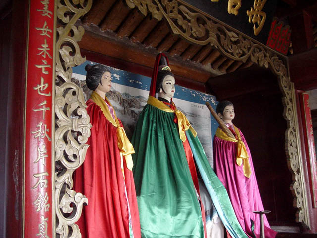 鐘樓位于山門右側,內懸古鐘一口,鐘體鑄有銘文、捐助人姓名和八卦圖。前、后殿均為懸山頂、三楹四窗。前殿內塑孟姜女像,旁塑二童,背包羅傘。龕上橫匾書,"萬古流芳",兩旁楹聯上款"秦皇安在哉萬里長城筑怨",下款"姜女未亡也千秋片石銘貞"。像后有"姜墳雁陣"彩繪壁畫。東壁有石刻"天下第一關"5個大字,與山海關城匾額規格一致。西壁石刻有清代皇帝乾隆、嘉慶、道光御筆題詩和民國年間鐫刻的康熙皇帝題詩以及民國年間軍閥政客的題詩。殿前廊柱上有一幅對聯,上聯為"海水朝朝朝朝朝朝朝落",下聯是"浮去長長長長長長長消"。后殿正面山墻原全部為神龕,中間有觀音菩薩,盤膝而座于蓮花托之上,托下一巨獸--望夫吼;東側有文殊菩薩,坐在蓮花上,下為獅子;西側有普賢菩薩,蓮座下為白象。三獸皆為臥式。在這3個神龕內每個菩薩的兩側各塑一童男童女。殿內東側塑韋陀像,身著盔甲,手使降魔杵;西則塑李靖像,左手托塔,右手持丈八蛇矛。墻上繪壁畫"西游記"。可惜均毀于1966年,現已重塑,恢復本來面目。