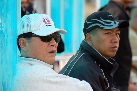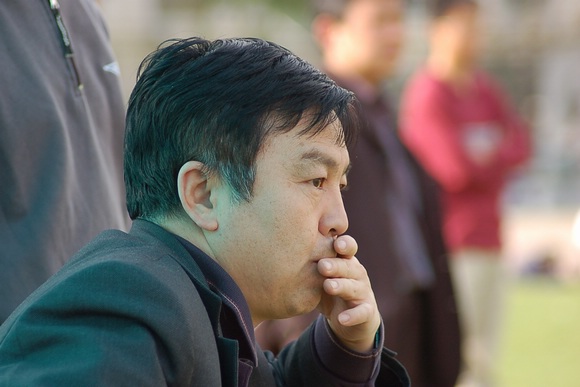 雖然比賽暫時落后,但我校足球隊主教練金志揚和教練王力依然運籌帷幄,成竹在胸。