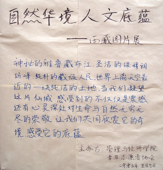 由管理與經濟學院青年志愿者協會組織的“自然華境 人文底蘊”--西藏圖片展目前正在中教大廳舉行。