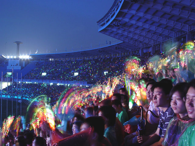 昨晚工體到處都閃現著志愿者的身影。有2000名志愿者分布在工體場內和場外周邊,如主要道路、公交地鐵站等地,為觀眾提供引導服務,或發放小扇子、臉貼、熒光棒等一些營造現場氣氛的小物品,維持秩序,清撿垃圾。
