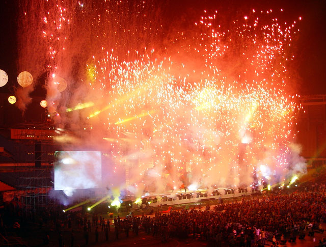 晚會的高潮出現在22時08分。四年前的這個時刻,當時的國際奧委會主席薩馬蘭奇宣布北京獲得2008年奧運會舉辦權。四年后的今天,當時針再一次指到22時08分時,激動人心的一幕重新上演——現場兩臺大屏幕回放四年前的紀錄片,隨后工體上空噴射出璀璨煙花,讓現場的數萬觀眾仿佛又置身于四年前申奧成功后的狂歡情景中。