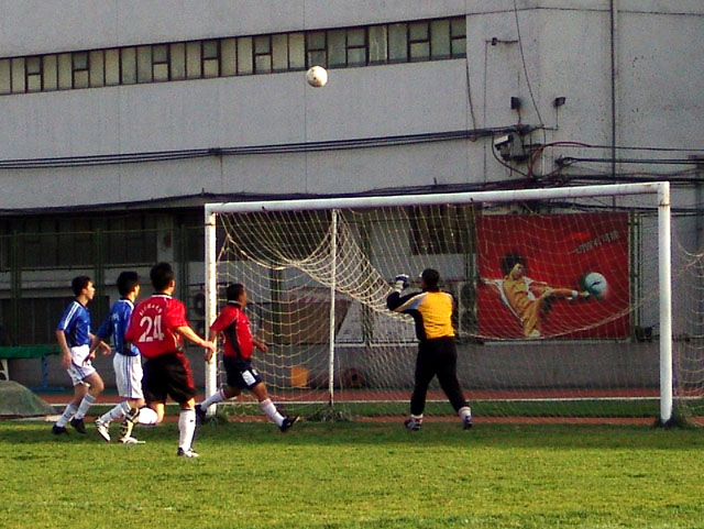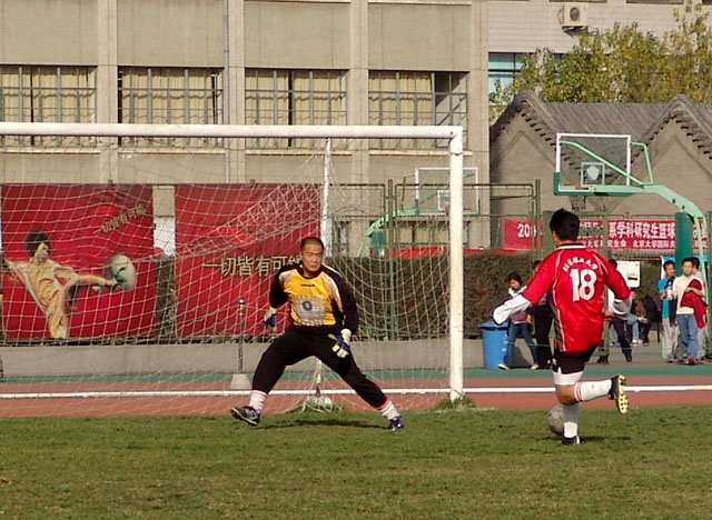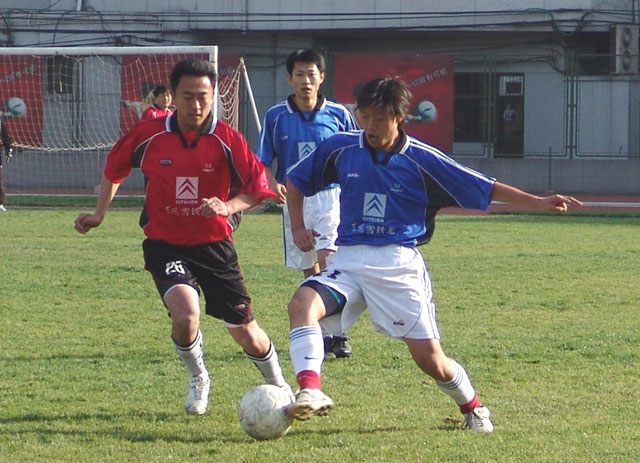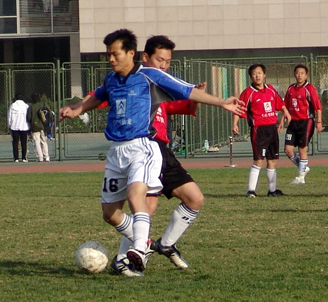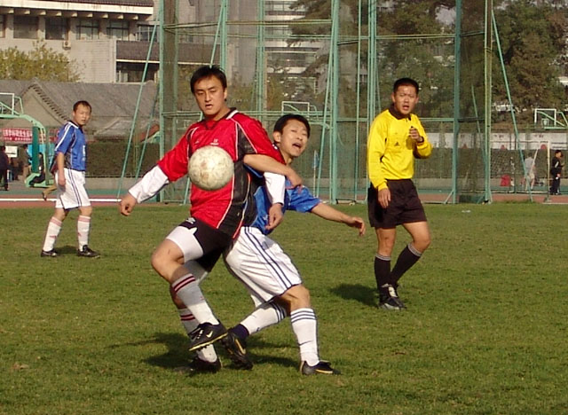 在與清華大學隊爭奪季軍的比賽中(紅衣為我校足球隊)
