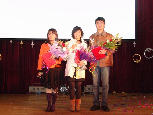 冠軍:生命科學與技術學院 李靖方(中);亞軍:管理與經濟學院  岳崧(左);季軍:信息科學技術學院  張藝檬(右)。