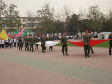 在雄壯的樂曲聲中,運動員入場式氣氛熱烈,精彩不斷,以班級為單位的方陣依次從主席臺前走過。首先走過主席臺的是由部分大一新生組成的彩旗方陣和鮮花方陣,整齊的方陣,響亮的口號,迎來陣陣掌聲。