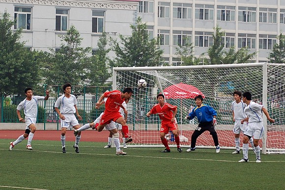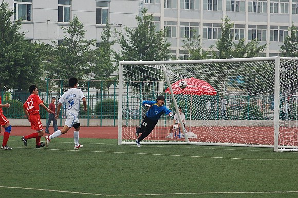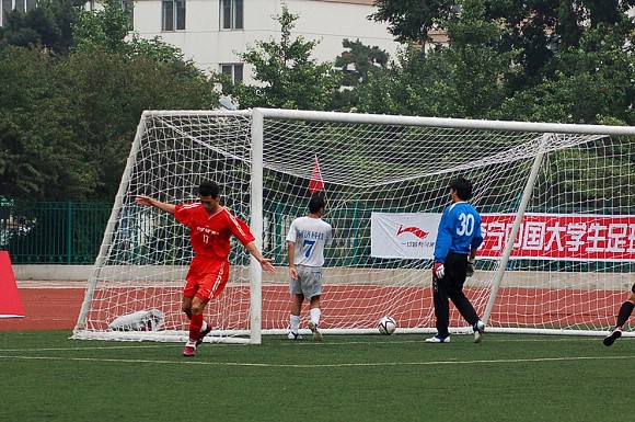 過于猛烈的進(jìn)攻并沒有敲開對方的大門,由于全部隊(duì)員過于壓上,反而使同濟(jì)大學(xué)足球隊(duì)在第10分鐘的一次防守反擊中獲得了點(diǎn)球的機(jī)會(huì)。我校足球隊(duì)守門員18號王毅飛身救球,這次角度非常之刁的點(diǎn)球竟然被王毅擋出門外從而化險(xiǎn)為夷,這給了全體隊(duì)員們極大的鼓勵(lì),大家在加強(qiáng)防守的基礎(chǔ)上繼續(xù)向?qū)Ψ酱箝T猛攻。