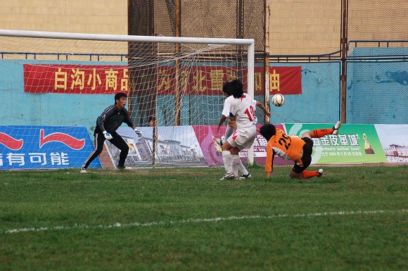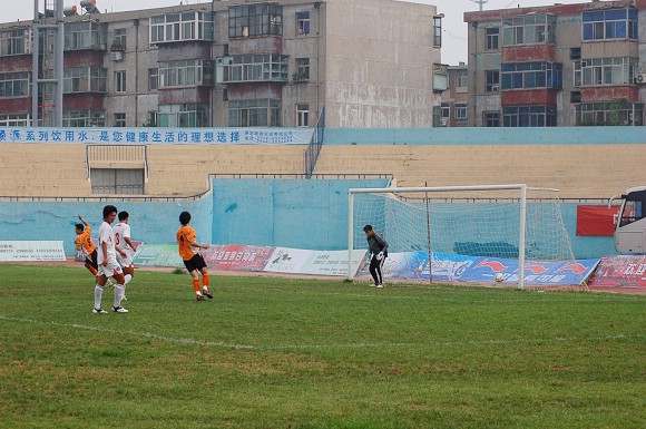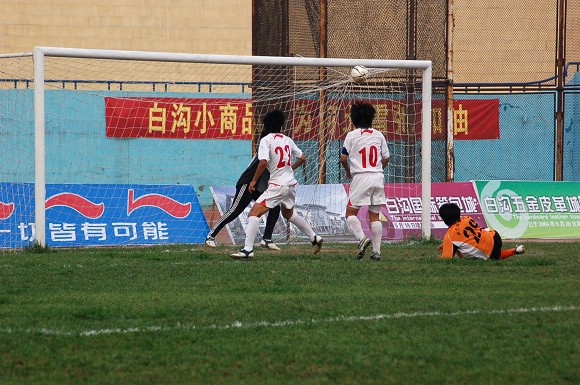 剛剛換上場的29號年輕球員秦陽在門前候個正著,抬腳勾射將比分鎖定了3-0的比分。