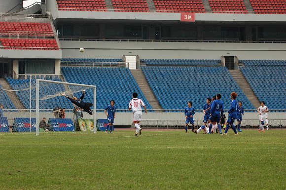 上半場第30分鐘,北理工隊員頭球射門,球竟然打在橫梁上彈出,令人惋惜。