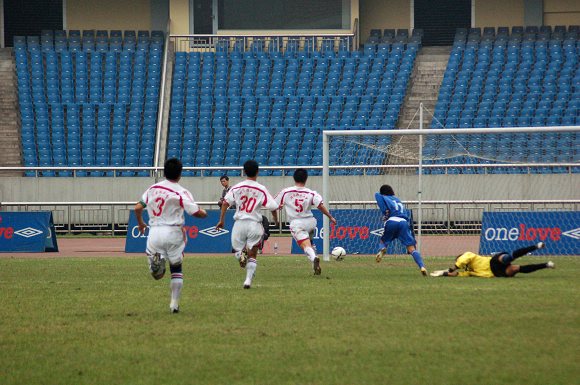 這時我校足球隊點球專家6號于飛正好拍馬趕到,一腳勁射,差點將球網射破!
