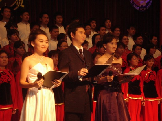 比賽于7點鐘準時開始,這次歌詠比賽的主持人是來自管理與經(jīng)濟學(xué)院的崔樂洋、聶曉愚、溫曉萌三位同學(xué),比賽開始前,先由主持人介紹了到場的評委以及來賓。我校黨委副書記常務(wù)副校長楊斌同志以及校團委的領(lǐng)導(dǎo)等出席比賽現(xiàn)場蒞臨指導(dǎo),更有長征組歌的作曲之一的著名老一輩革命作曲家、總政歌舞團著名指揮家等著名音樂人士出席本次比賽擔當評委。