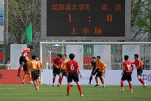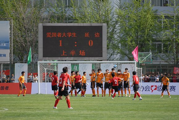 就在上半場第21分鐘愛國者大學生隊隊長袁微再度殺入禁區,可惜身體不及延邊隊,被延邊隊“雙鬼關門”。表現出色的還有愛國者大學生隊的門將1號,上半場22分鐘,延邊隊一紀長傳,多虧門將及時出擊,在禁區外的側掛救險,才化解了學生軍的險情。