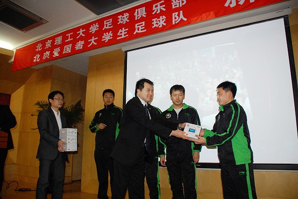 球隊冠名贊助商代表,華旗愛國者總裁特別助理苗峻先生發言時首先對球隊一年的表現給予肯定。他表示:學生軍初戰職業聯賽,這支并不被外界看好的學生軍在2007年交出了一份滿意的答卷。在內外援引進受條件限制下,學生軍在中甲賽場發揮出了團隊的亮劍精神,在金志揚所倡導的智、快、活的思想下這些學生球員展示出了自己的才華,尤其是在與廣藥隊的兩場中,讓這支中甲冠軍感到了心跳,學生軍不僅收獲一個平局,而且在兩場比賽中打進對手5個進球,要知道廣藥整個賽季也只是丟掉了15球。2007年初公司決定冠名贊助球隊,主要是看中了球隊“團隊精神,自強不息”的特質,這一精神恰恰也是愛國者企業和團隊的核心。愛國者從200元起家發展到現在年營業額達20億的公司、從默默無聞發展到中國數碼行業第一品牌、在中國數碼相機領域孤身與強大的外系競爭對手較量靠的都是這種精神。而在足球場上北京理工大學足球隊也依靠這種精神戰勝了一個又一個強大的對手,實現了一個又一個中國足壇的奇跡。球員們一年的表現也證明了愛國者的選擇是正確的。