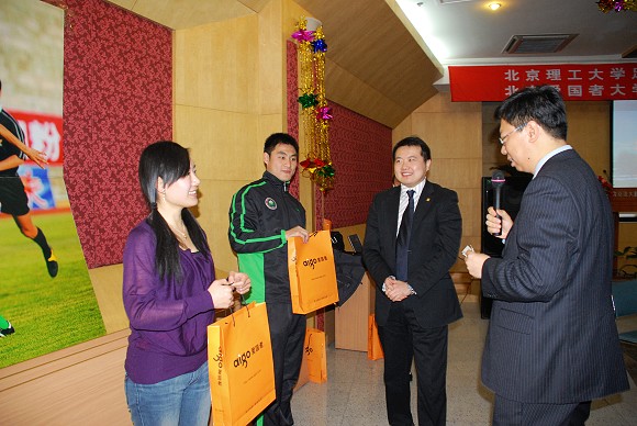 團拜會上,還進行了抽獎活動,由華旗愛國者提供了豐厚的獎品。媒體記者還就所關心的問題向學校領導和足球隊總教練金志揚、主教練曹限東、隊員們進行了提問,并進行了深入采訪。