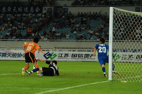 僅僅過了7分鐘,舜天國信隊卷土重來,譚斯在邊路奮力救出一個差點出界的球,帶球從邊路快速疾進,禁區前射了一個近角,4:1,舜天國信隊大比分領先。
