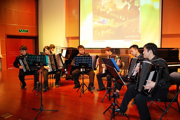 首場(chǎng)演出的鍵盤(pán)樂(lè)團(tuán)由張清老師指導(dǎo)的手風(fēng)琴樂(lè)團(tuán)和王倩老師指導(dǎo)的鋼琴樂(lè)團(tuán)組成。兩位老師是藝術(shù)中心的業(yè)務(wù)骨干,她們專業(yè)過(guò)硬、思路靈活,同時(shí)非常重視藝術(shù)門(mén)類(lèi)之間交流合作。在歷年的專場(chǎng)音樂(lè)會(huì)中,多次嘗試將鍵盤(pán)樂(lè)和其他藝術(shù)元素相結(jié)合,借助科技手段貼切地表達(dá)音樂(lè)的內(nèi)涵,演出使廣大同學(xué)得到美好的視聽(tīng)享受,在校園里引起強(qiáng)烈反響。
