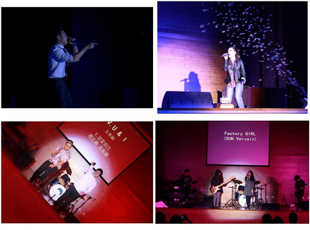 北理工第一支女子樂隊Sun Vervain帶來富有節(jié)奏感的《factory girl》和《Rose》,還有同學(xué)們對小提琴名曲《Purple passion》的全新演繹;由08級學(xué)長王東喆的《You and I》以及他與通識課學(xué)生11級符之煥共同演唱的《改變自己》將音樂會推向高潮,動感而激情的演唱與動作完美的融合,感染了在場的所有觀眾;1017爵士樂組合也為大家?guī)砹伺c眾不同的爵士風(fēng);通識課11級學(xué)生葛培原一首《I will always love you》的深情演唱感動全場,而接下來他與韓欣欣的《We will rock you》也是引起全場觀眾共鳴;子夜樂隊的《鬧海》《萬家燈火》更是讓人們眼前一亮。