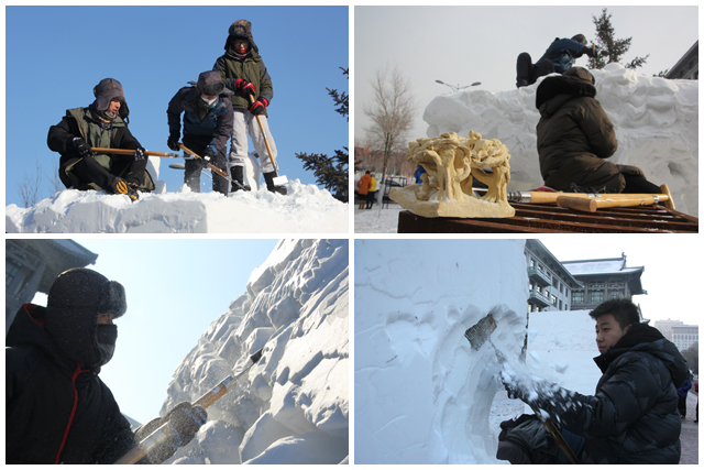 1月3日晚,大賽組委會舉行了簡單的開幕儀式和雪塊抽簽環節,1月4日上午8時,大賽進入正式比賽階段。1月的冰城寒風凜冽,北理工雪雕隊冒著零下20度的嚴寒,克服了低溫、病痛、時間緊迫等不利因素,夜以繼日的奮戰在雪雕大賽最前線,將全部精力集中于作品的創作之中。團隊如火的創作熱情,精湛的雕刻技藝成為了大賽中一道亮麗的風景線。