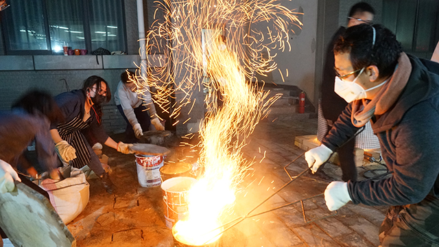 “出窯啦!”伴隨著幾聲歡呼,一個個剛剛熔融的陶藝作品,被從窯中夾出,放入裝有可燃物的鐵桶中時,頓時煙火翻騰,釉色金燦,給人一種美輪美奐的感覺,火焰升騰的畫面,令圍觀的學生們激情澎湃,無比欣喜。以上一幕并不是發生在遙遠的瓷都或者陶鄉,而就發生在北京理工大學良鄉校區理學樓東側一隅,這里矗立起一座不大的陶窯,在這個名為“樂燒workshop”的課程里,北理工學子在老師帶領下,親自燒制自己設計的陶藝作品。